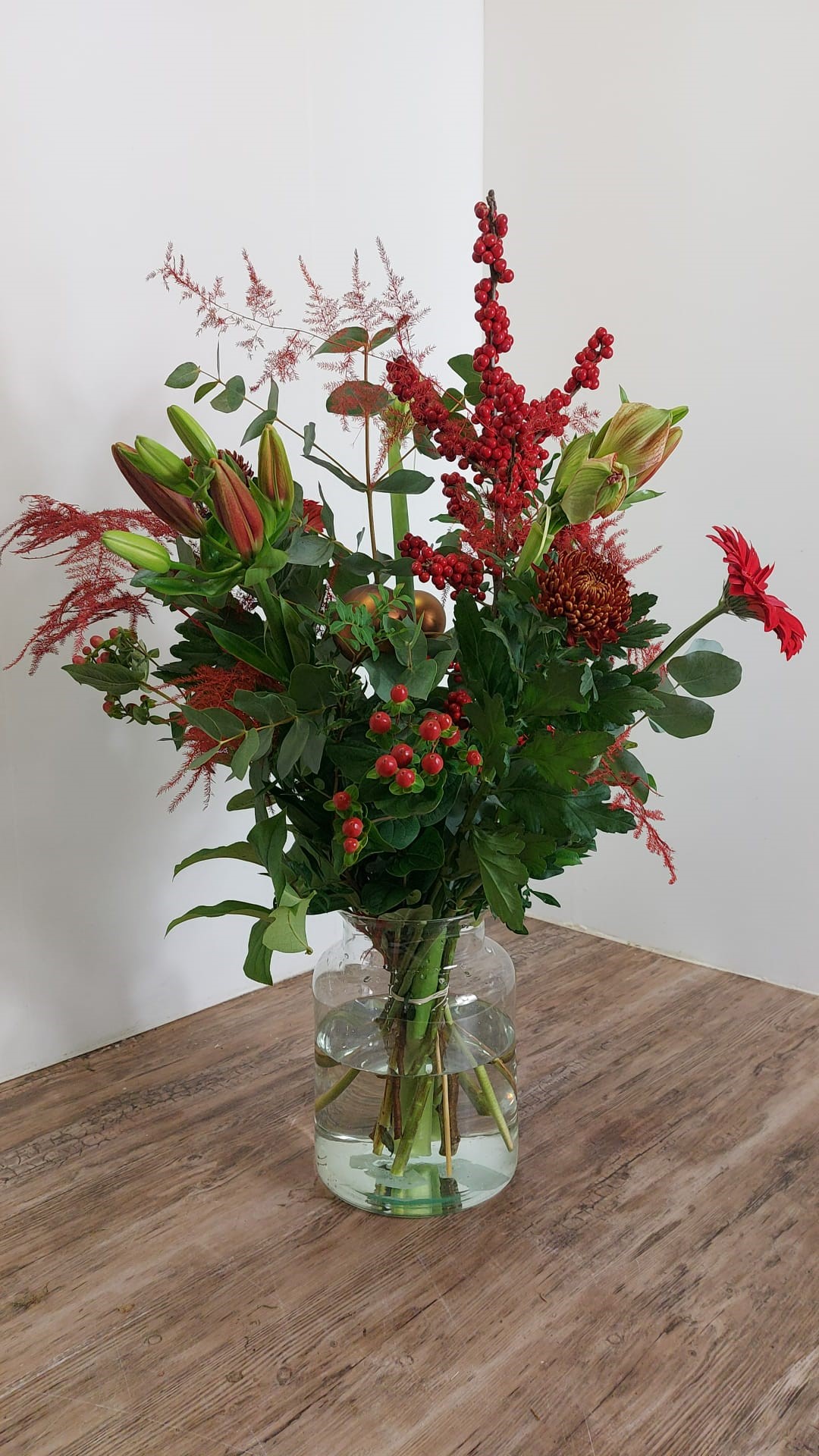 Breng warmte en sfeer in huis met ons prachtige rode kerstboeket, met zorg samengesteld door de bloemist.